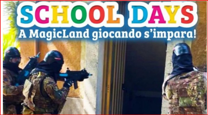 Era stato un post promozionale a fare discutere: una locandina colorata, con la scritta arcobaleno “School Days – A MagicLand giocando s’impara!”, affiancata alla foto di uomini in mimetica intenti a simulare un’irruzione militare. L’iniziativa – parte delle giornate didattiche rivolte alle scuole in programma il 13 e 14 maggio 2026 – includeva, tra le decine di attività previste, anche una simulazione “realistica” di ingresso in un centro abitato con individuazione, immobilizzazione e trasporto di un “elemento ostile”
