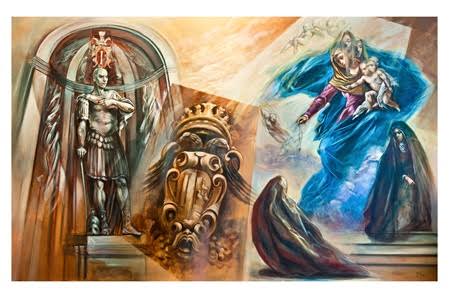 SESTA OPERA – COLONNA E ORSINI: ologramma di un sodalizio. In questo quadro emerge il tema del potere, rappresentata dalle due casate che, unendosi, sugellano e rafforzano i loro imperi. L’ologramma è l’elemento di unione tra reale e virtuale, filo conduttore dell’intero progetto. Oltre ai protagonisti Marcantonio e la sua futura sposa Felice Orsini, spicca l’elemento spirituale, raffigurato dal volo di angeli che benedicono l’unione dei due personaggi ma che simboleggiano anche il mistero, l’imprevisto, il pericolo raffigurato anche dalla figura scura che scende le scale, lontano dallo spazio idilliaco dell’ologramma. Felicità e dolore, sentimenti costanti della realtà umana