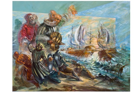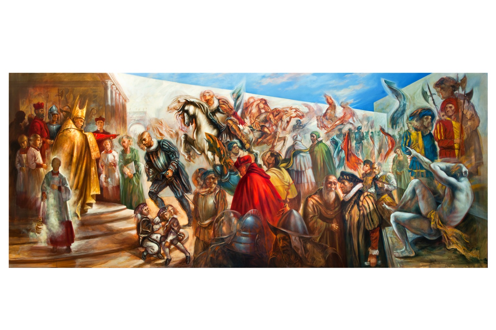 PRIMA OPERA – BENEDIZIONE E COMANDO PER UNA GRANDE FLOTTA– Con il primo e spettacolare quadro (400 x 200 cm)) Stefano Piani inizia il suo viaggio così come Marcantonio Colonna, in quel lontano 11.06.1570, spiegò le vele verso la città greca di Lepanto dopo aver ricevuto da Papa Pio V lo scettro del comando della flotta cristiana. L’opera raccoglie le emozioni di un momento solenne e fondamentale sia per la chiesa che per la storia della famiglia Colonna. La figura di Marcantonio e l’idea della futura battaglia diventano gli elementi cardine di tutto il progetto. Il tema qui è legato alla spiritualità, alla necessità dell’essere umano di guardare al divino come ispirazione e protezione.