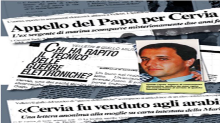 Settembre 1990. – L’ex sergente di Marina Davide Cervia viene rapito a Velletri mentre è in corso la Prima Guerra del Golfo. La Nato contro Saddam Hussein che invase il Kuwait. Si ritrovò l’auto ma di Cervia si persero le tracce. Una spia del Sismi, Mario Ferraro, venne trovato “suicida” al porta-asciugamani del bagno. Era coinvolto nella scomparsa del giudice Adinolfi, rapito nel luglio del ’94, quando indagava sulle società di copertura dei Servizi Segreti.