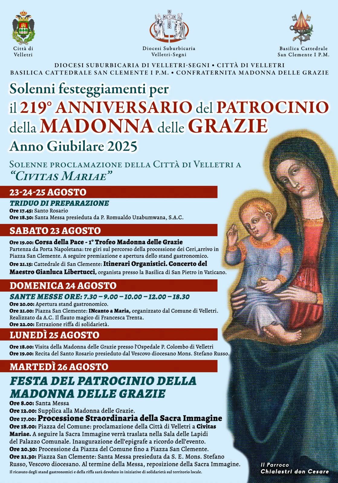 - La proclamazione di Velletri a “Civitas Mariae” avverrà oggi pomeriggio alle 18:00 in Piazza del Comune. A seguire la Sacra Immagine di Maria sarà traslata nella Sala delle Lapidi del Palazzo Comunale. Inaugurazione dell’epigrafe a ricordo dell’evento. Alle 20:30 da piazza del Comune fino a piazza San Clemente (antistante la Cattedrale di Velletri). Alle 21:30 in piazza San Clemente sarà celebrata la Santa Messa presieduta da monsignor Stefano Russo Vescovo di Velletri-Segni e Frascati. Al termine della Messa reposizione della Sacra Immagine nella Cattedrale di Velletri.