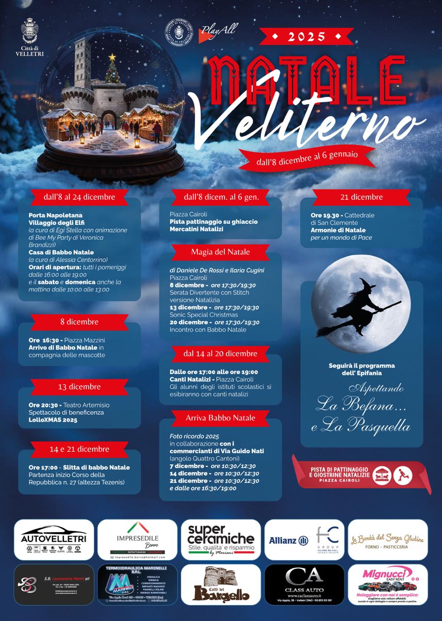 Velletri 28 novembre 2025 – Dall’8 dicembre al 6 gennaio, l’Amministrazione comunale ha stilato un programma di eventi pensato per le famiglie, per i bambini e per chi vuole vivere la magia delle feste insieme.