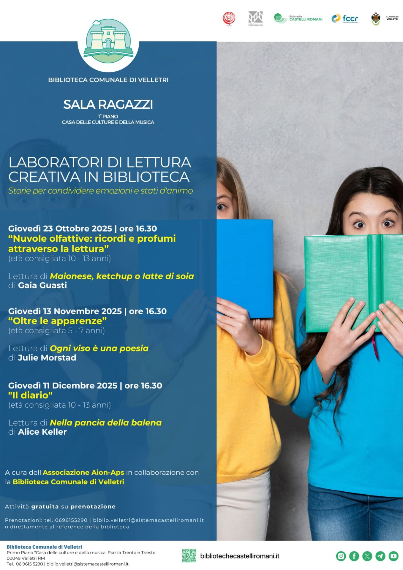 - Giovedì 23 ottobre 2025 alle ore 16.30 presso la Biblioteca comunale di Velletri “Augusto Tersenghi” riprende il nuovo ciclo dei “Laboratori di lettura creativa. Storie per condividere emozioni e stati d’animo”