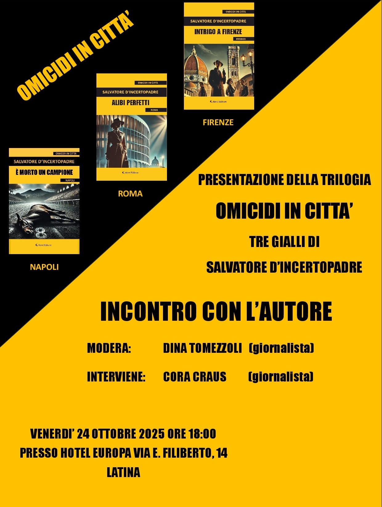Latina 22 ottobre 2025 -Sarà presentata venerdì 24 ottobre alle ore 18.00, presso l’Hotel Europa di Latina (in via E. Filiberto 14), la trilogia Omicidi in città di Salvatore D’Incertopadre.
