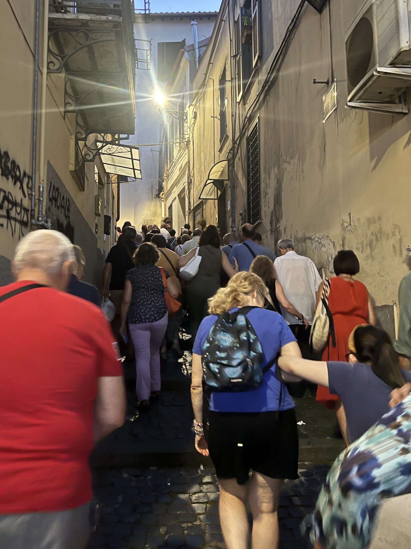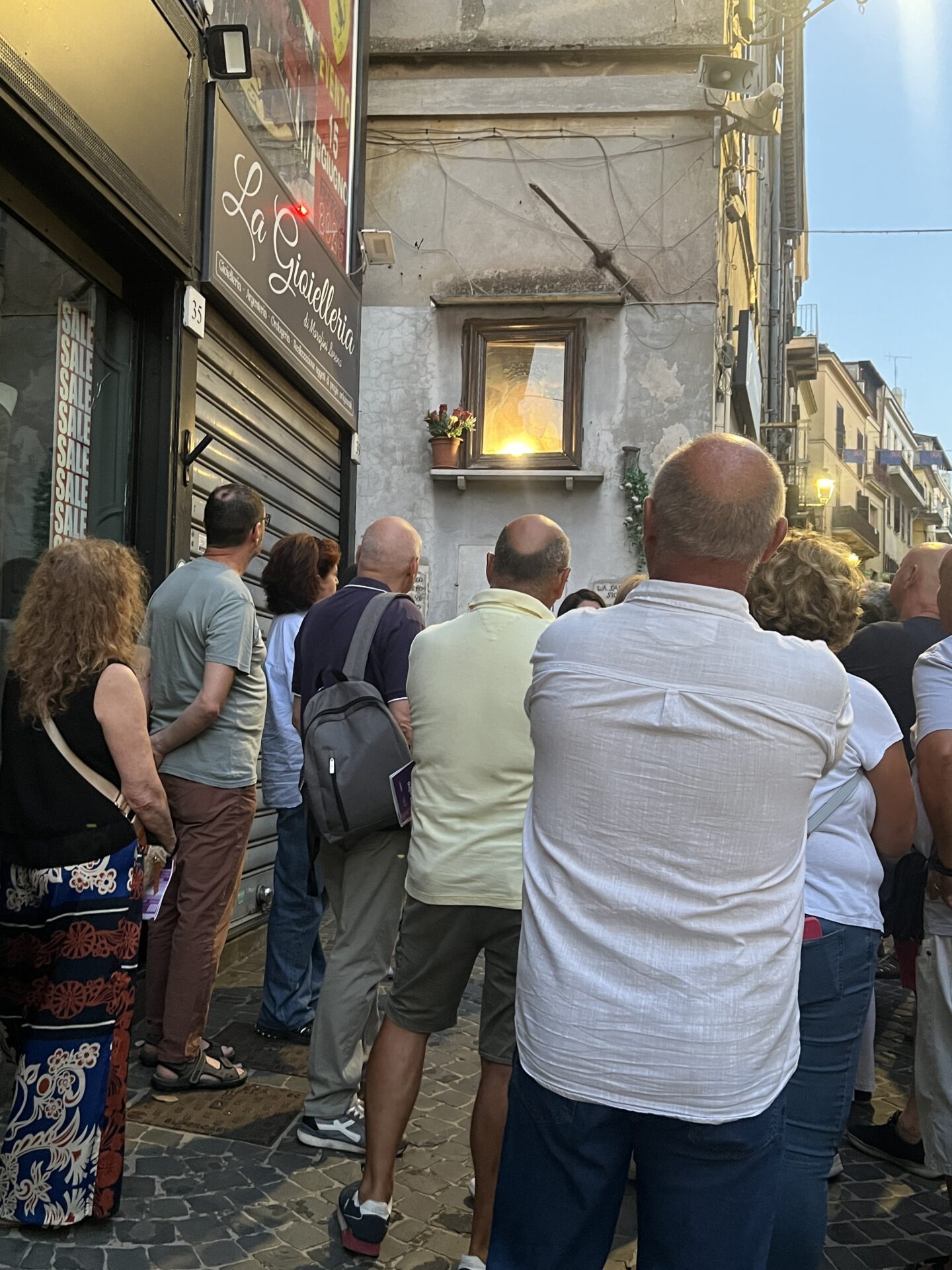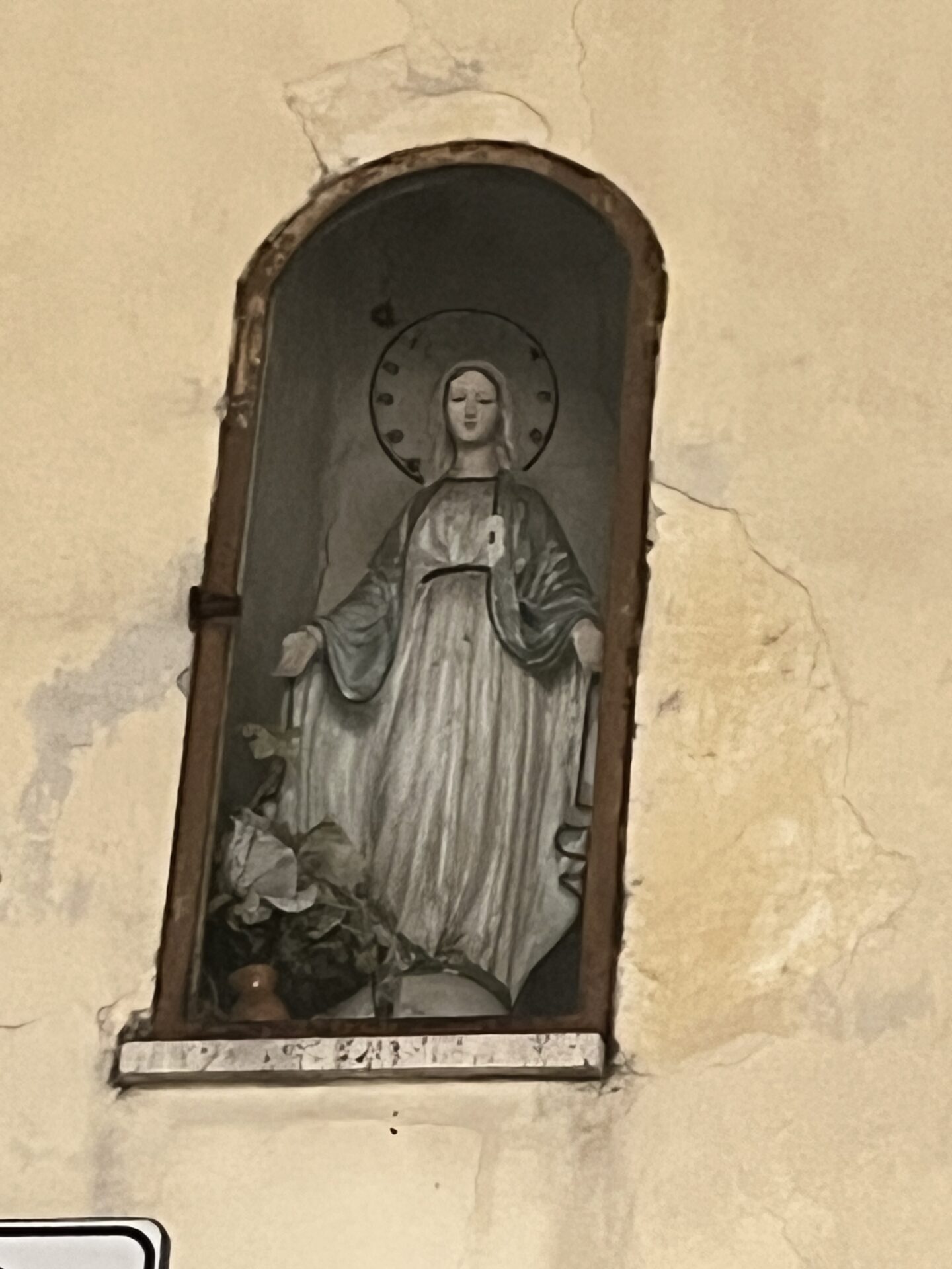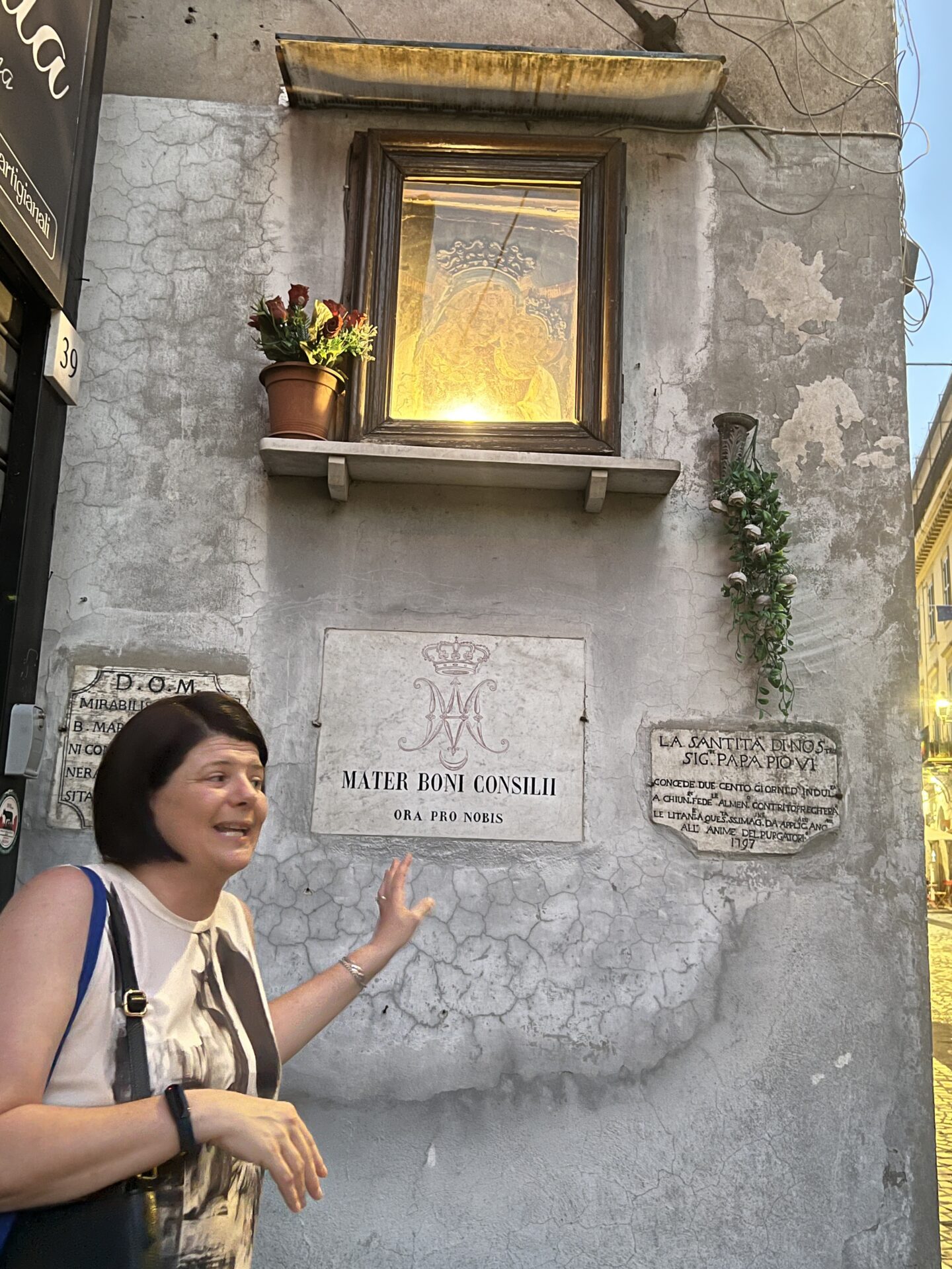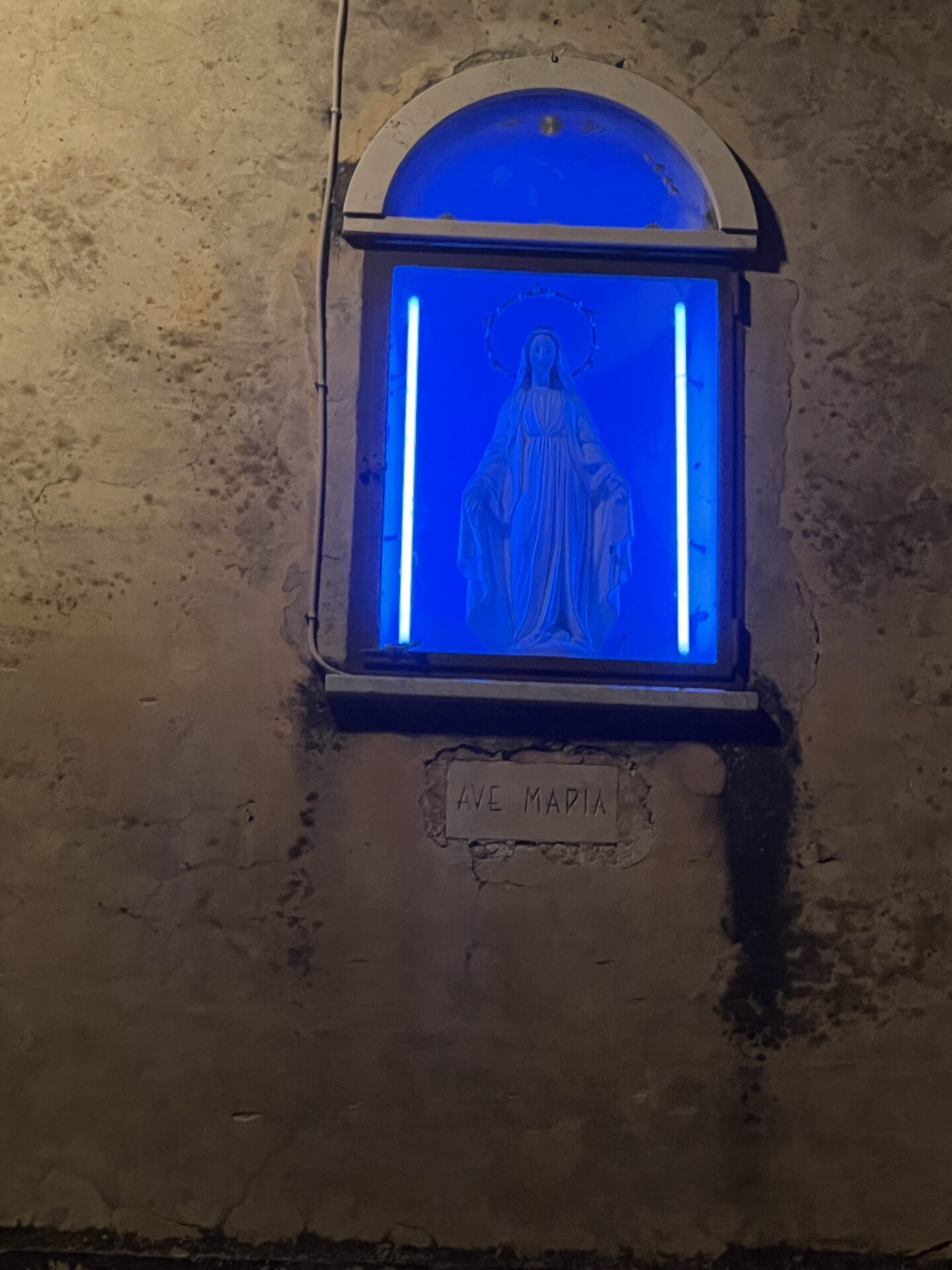 La passeggiata è stata un’occasione per conoscere la storia delle icone mariane nella nostra città, e dei cristogrammi, espressione simbolica sui portali antichi, ritratto spirituale dei veliterni, e per ascoltare le parole del prof. Battistella, il vian Dante che ha declamato il I canto del Purgatorio che apre le porte ad un diverso regno ultraterreno “Per correr miglior acque alza le vele ormai la navicella del mio ingegno, che lascia dietro a sé mar sì crudele; e canterò di quel secondo regno dove l’umano spirito si purga e di salire al ciel diventa degno. Dante vuole descriverci il disagio dell’uomo moderno, della ragione quando va incontro al mondo della Grazia.
