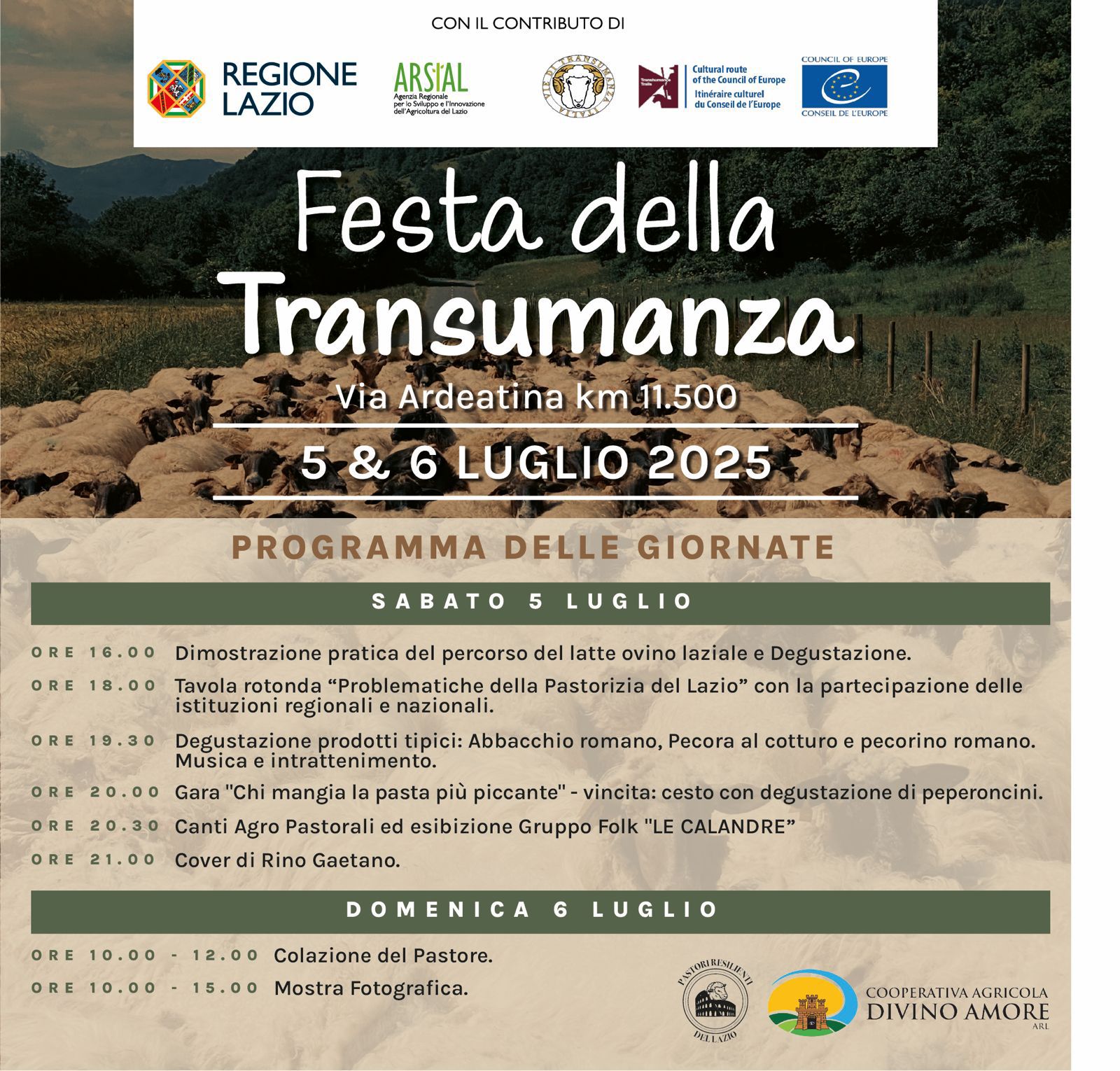 Roma (Rm) – Una due giorni all’ insegna della transumanza e della tradizione casearia laziale. Sabato 5 luglio a partire dalle ore 16 in via Ardeatina km 11.500 a Roma nella suggestiva location della Cooperativa Agricola del Divino Amore, ci sarà una dimostrazione pratica del latte ovino laziale con degustazione.