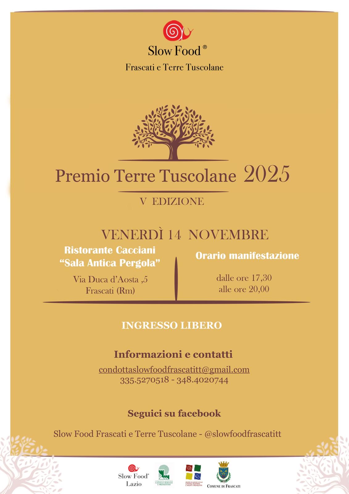 Il “Premio Terre Tuscolane 2025” è patrocinato da: GAL Castelli Romani e Monti Prenestini, Comunità Montana Castelli Romani e Prenestini, Slow Food Lazio, Comune di Frascati.