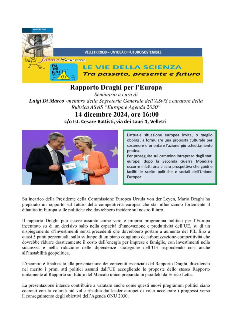 Il 14 dicembre a Velletri presso l’Istituto Cesare Battisti di Via dei Lauri, n° 1, ore 16:00 seminario a cura di Luigi Di Marco, membro della Segreteria Generale dell’ASviS e curatore della Rubrica ASviS “Europa e Agenda 2030”