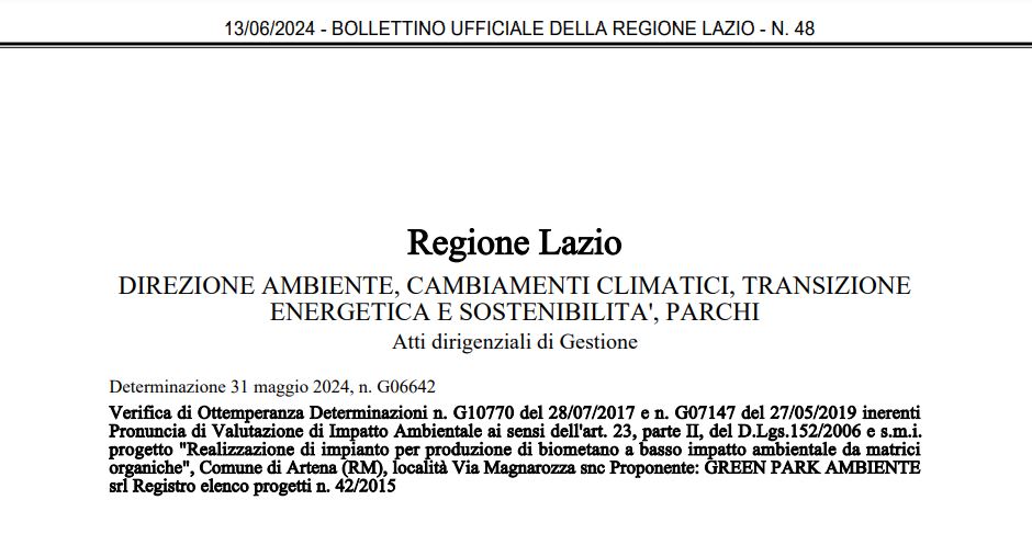 con Determinazione n. G06642 dal titolo: “Verifica di Ottemperanza Determinazioni n. G10770 del 28/07/2017 e n. G07147 del 27/05/2019 inerenti. Pronuncia di Valutazione di Impatto Ambientale ai sensi dell’art. 23, parte II, del D.Lgs.152/2006 e s.m.i. progetto “Realizzazione di impianto per produzione di biometano a basso impatto ambientale da matrici organiche”, Comune di Artena (RM), località Via Magnarozza snc Proponente: GREEN PARK AMBIENTE srl Registro elenco progetti n. 42/2015 la Regione Lazio ha dato il via libera alla realizzazione della centrale di Biometano che dovrà essere realizzato entro 5 anni.