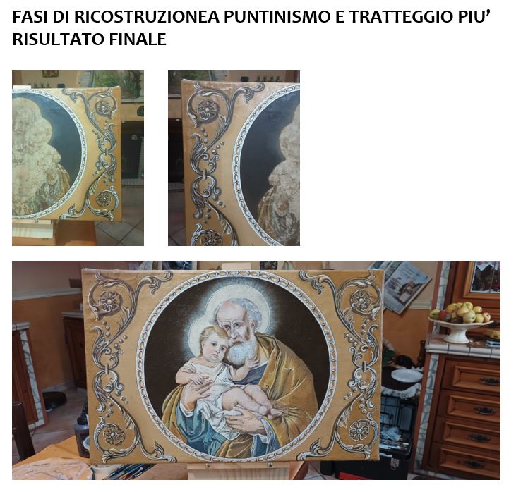 - Da qui, è iniziata l’integrazione pittorica quasi totale, a puntinismo e tratteggio con l’ausilio di foto dell’Opera originale trovate online, il tutto con colori ad olio professionali per restauro quadri: Maimeri + Winsor &Newton.