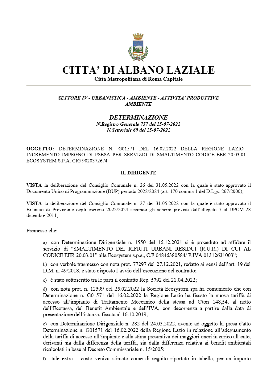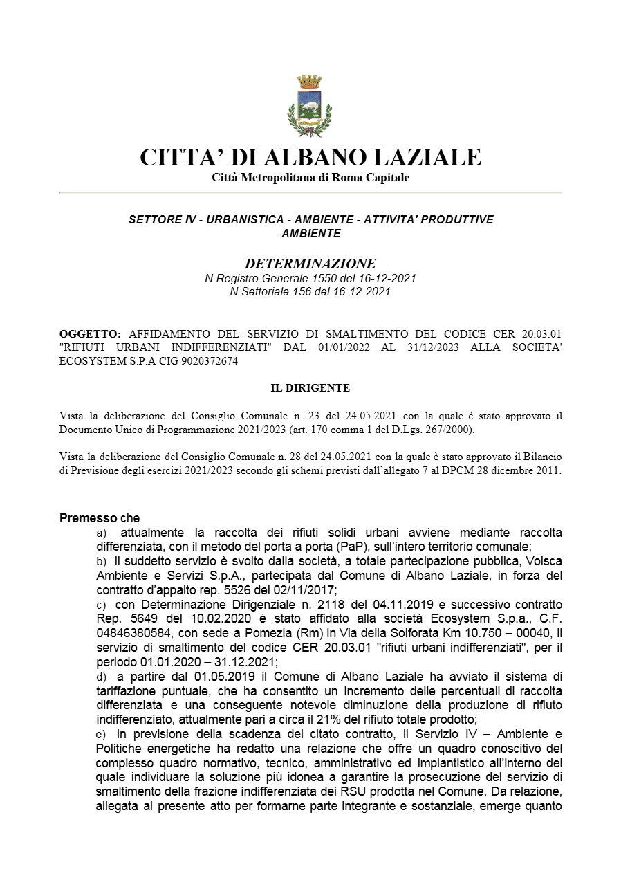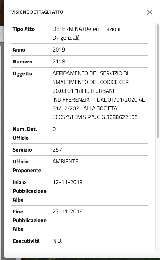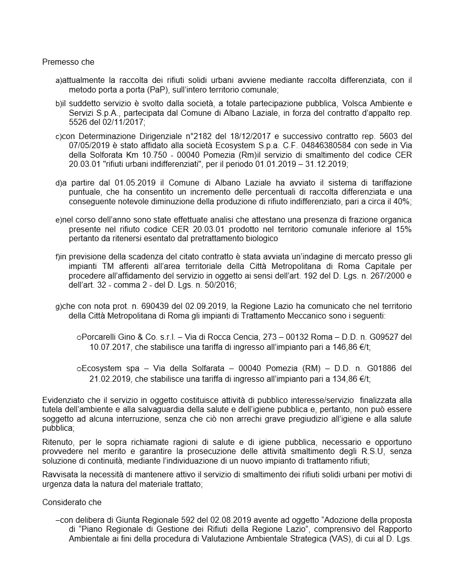 Il primo collegamento tra Albano ed Ecosystem risale al 2019, quando Federica Giglio, allora Responsabile del Procedimento Amministrativo, firmò la determinazione n. 2118 del 12 novembre, assegnando 1,13 milioni di euro alla società senza bando, invocando l’art. 63, comma 2, lettera b., punto 2 del D.Lgs. 50/2016: “Quando i servizi possono essere forniti unicamente da un determinato operatore economico.”