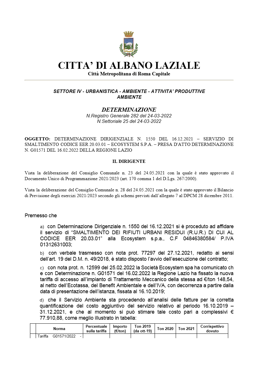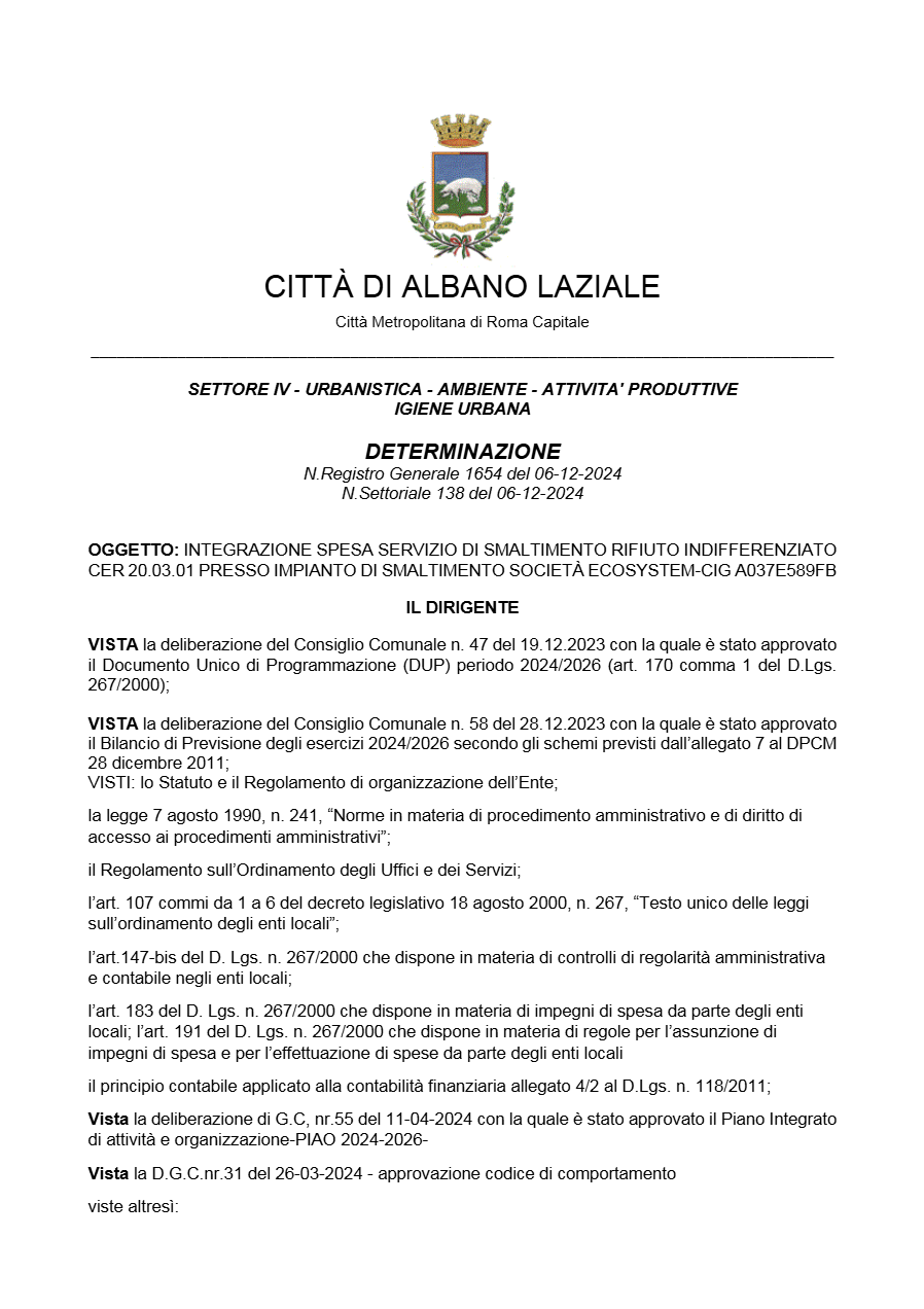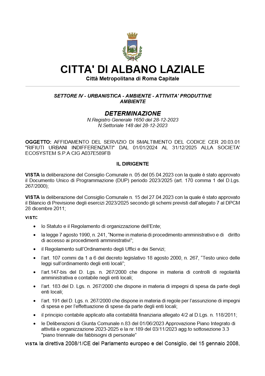 Il primo collegamento tra Albano ed Ecosystem risale al 2019, quando Federica Giglio, allora Responsabile del Procedimento Amministrativo, firmò la determinazione n. 2118 del 12 novembre, assegnando 1,13 milioni di euro alla società senza bando, invocando l’art. 63, comma 2, lettera b., punto 2 del D.Lgs. 50/2016: “Quando i servizi possono essere forniti unicamente da un determinato operatore economico.”