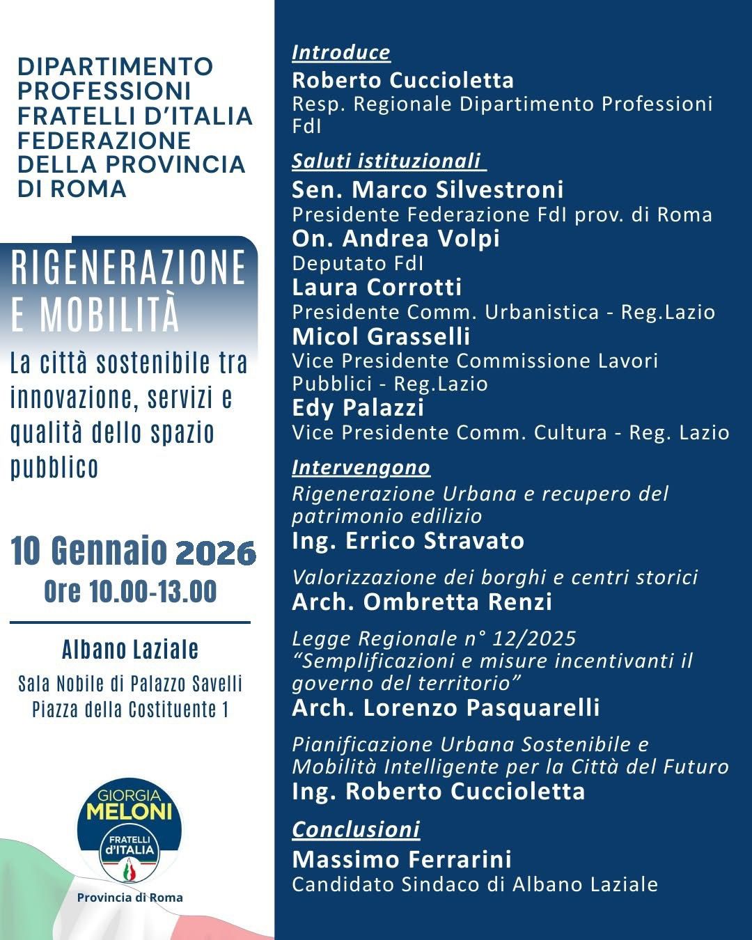 Albano 5 gennaio 2026 – “Sabato 10 gennaio 2026, presso la Sala Nobile di Palazzo Savelli ad Albano Laziale, si terrà l’incontro pubblico “Rigenerazione e Mobilità – La città sostenibile tra innovazione, servizi e qualità dello spazio pubblico”, promosso dal Dipartimento Professioni di Fratelli d’Italia – Federazione della Provincia di Roma.