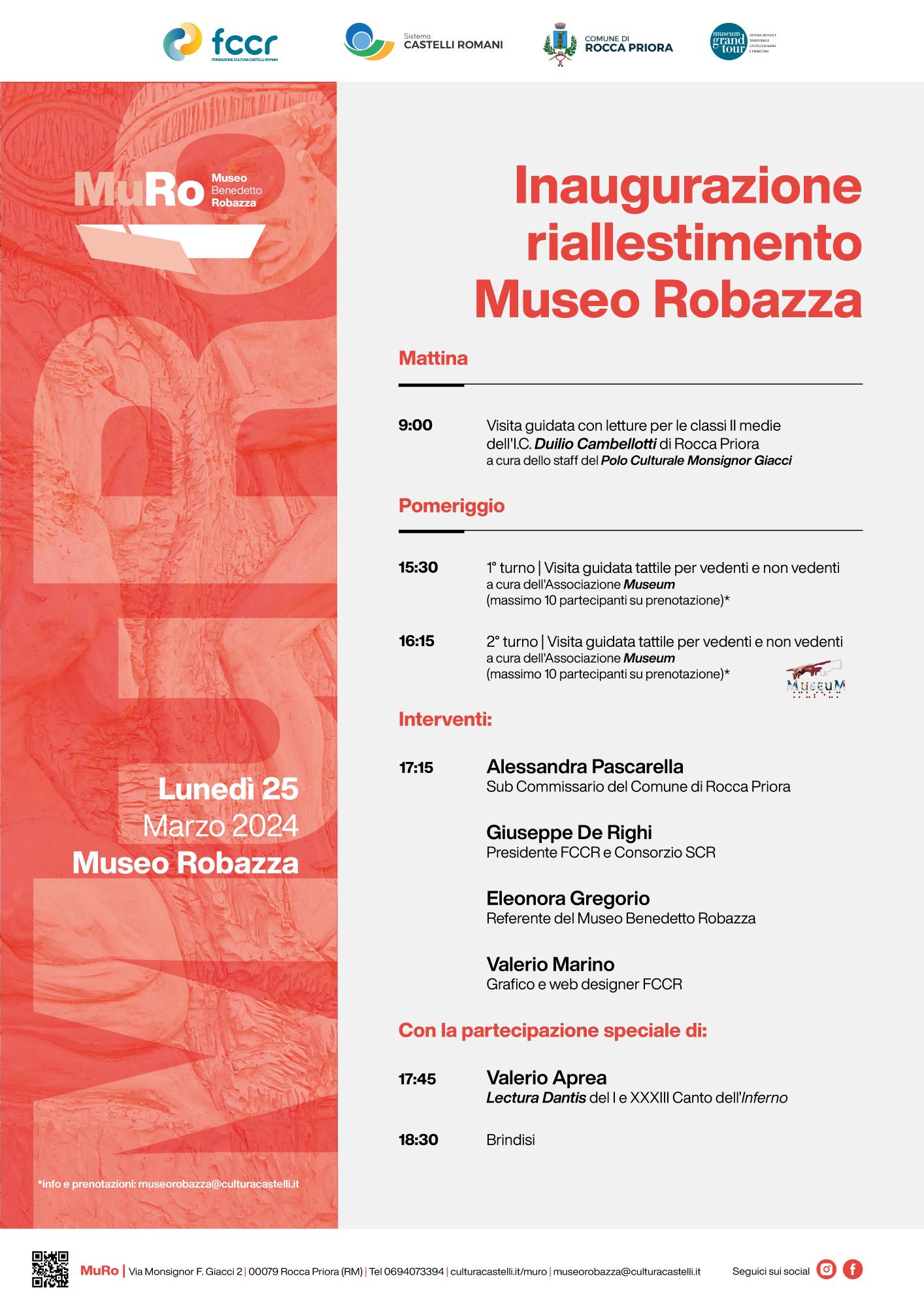 Il Museo si trova nel cuore del Centro storico di Rocca Priora, all’interno del “Polo Culturale Monsignor Francesco Giacci”, e ospita la mostra permanente dello scultore Mario Benedetto Robazza – scomparso nel 2020 – : suggestive opere scultoree in marmo e in bronzo e dipinti che delineano un percorso unico ispirato alla Divina Commedia di Dante Alighieri ed in particolare ai trentaquattro canti dell’Inferno. Ammirando l’allestimento museale è possibile ripercorrere la genesi dell’opera del Maestro Robazza in quel continuum di studi e di approfondimenti che, a partire dalla prova d’autore in bronzo ai dipinti e ai bozzetti, si chiude con l’opera monumentale, vero capolavoro del Maestro e unica nel suo genere: un nastro di sculture lavorate in altorilievo per una superficie di 90mq che racchiudono tutti i canti dell’Inferno.
