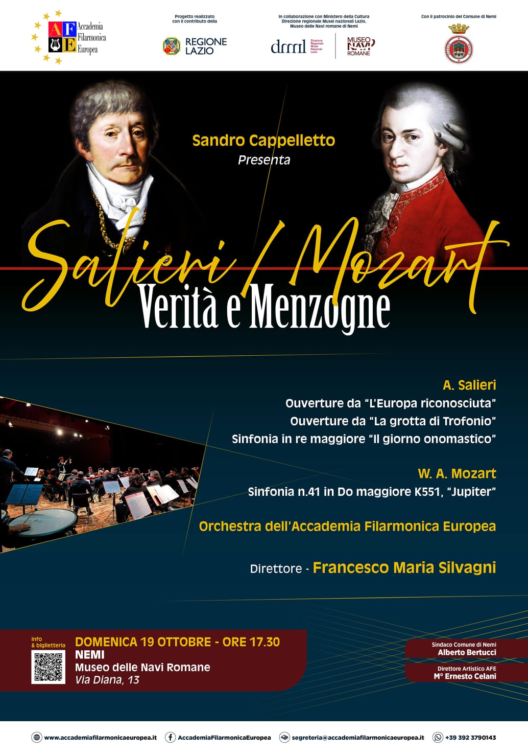 La rassegna proseguirà il giorno successivo, domenica 19 ottobre, con un evento speciale nel Lazio; in collaborazione con il Museo delle Navi Romane econ il patrocinio del Comune di Nemi, il concerto-racconto approderà al Museo delle Navi Romane, con inizio alle 17.30. Ogni serata sarà molto più di un semplice concerto, sarà un incontro ravvicinato con la musica e la storia, un racconto coinvolgente in cui Salieri, finalmente, prende la parola.
