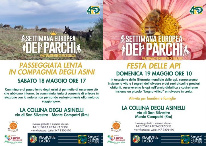 Per l’occasione il Parco dei Castelli Romani organizza alcuni eventi, tra i quali quelli che si svolgeranno presso la Collina degli Asinelli, sabato 18 maggio con la “Passeggiata lenta in compagnia degli asinelli”, e domenica 19 maggio con “La Festa delle api”. Le descrizioni sono disponibili nelle locandine postate.