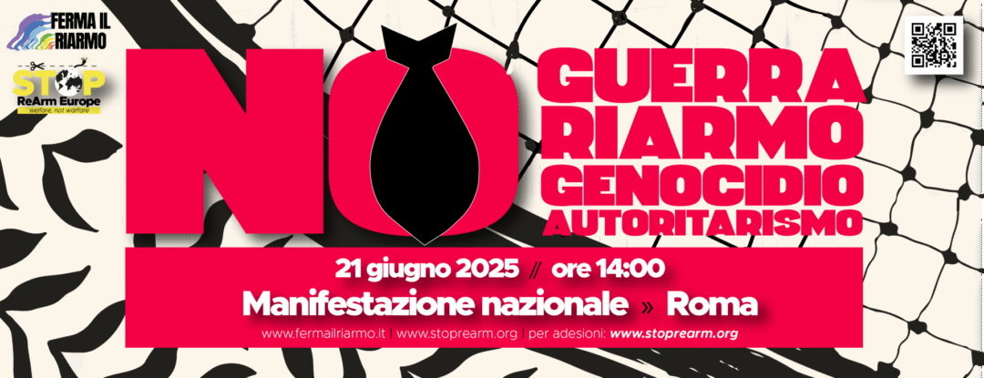 E’ l’appello lanciato a tutte le reti e organizzazioni dai promotori italiani della Campagna europea “Stop Rearm Europe”, Arci, Ferma il Riarmo (Sbilanciamoci, Rete Italiana Pace e Disarmo, Fondazione Perugia Assisi, Greenpeace Italia), Attac e Transform Italia, in vista della manifestazione nazionale contro guerra, riarmo, genocidio e autoritarismo prevista il prossimo 21 giugno a Roma alle ore 14, in occasione del vertice Nato a L’Aja, che deciderà sul piano di riarmo europeo.