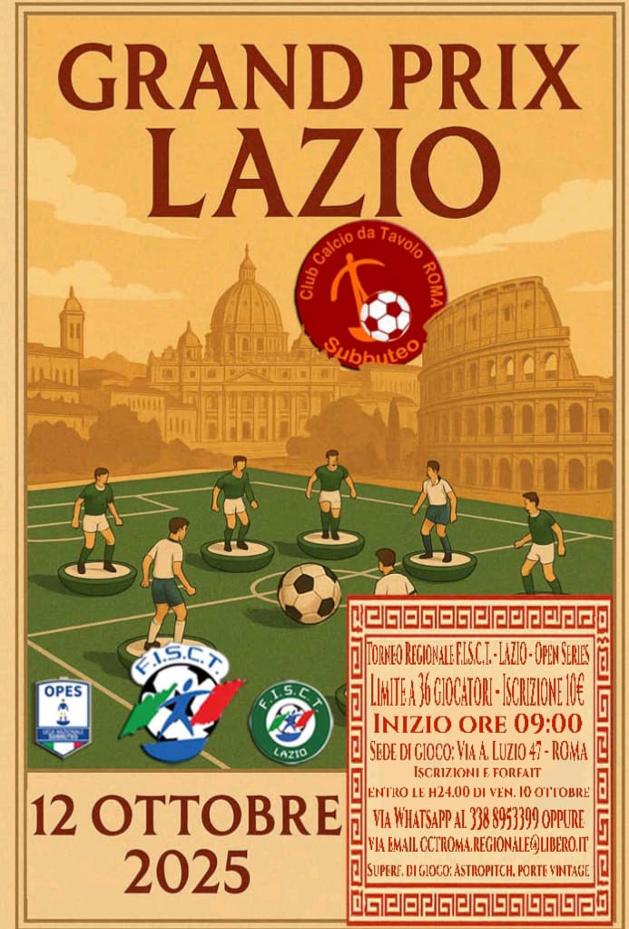 Roma 29 settembre 2025 – Domenica 12 ottobre 2025 con calcio d’inizio alle ore 9, si disputerà il Gran Prix Lazio di Subbuteo Tradizionale presso la location di Via Luzio n 47.