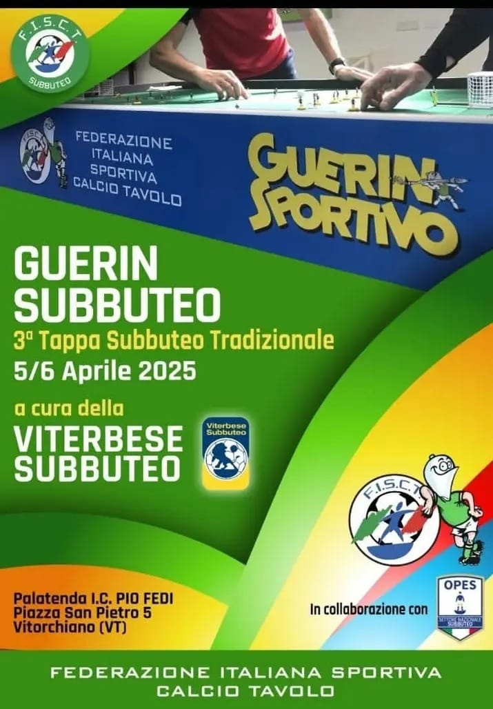 Sabato 5 Aprile 2025 con calcio d’inizio alle ore 9 andrà in scena il Guerin Sportivo categoria individuale di Subbuteo tradizionale a Vitorchiano nella Tuscia, l’evento agonistico sportivo è organizzato dalla Federazione Italiana Sportiva Calcio tavolo in collaborazione con il Settore nazionale Subbuteo Opes Italia ente di promozione sportiva riconosciuta dal Coni, con la Viterbese Subbuteo più con la storica rivista “Il Guerin Sportivo”.