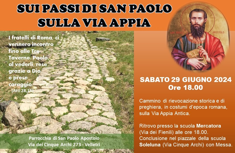 SABATO 29 GIUGNO, ORE 18, onoreremo San Paolo percorrendo a piedi un breve tratto di via Appia Antica, sostando in mezzo al verde della campagna per rievocare alcune scene di quel suo viaggio, descritto nel libro degli Atti degli Apostoli (cap. 23-28) e adattate da don Flavio Peloso. Gli attori saranno guidati dalla regia di Gregory Specchi, tutti in vestiti d’epoca romana, con la cura di Nadia Vita.