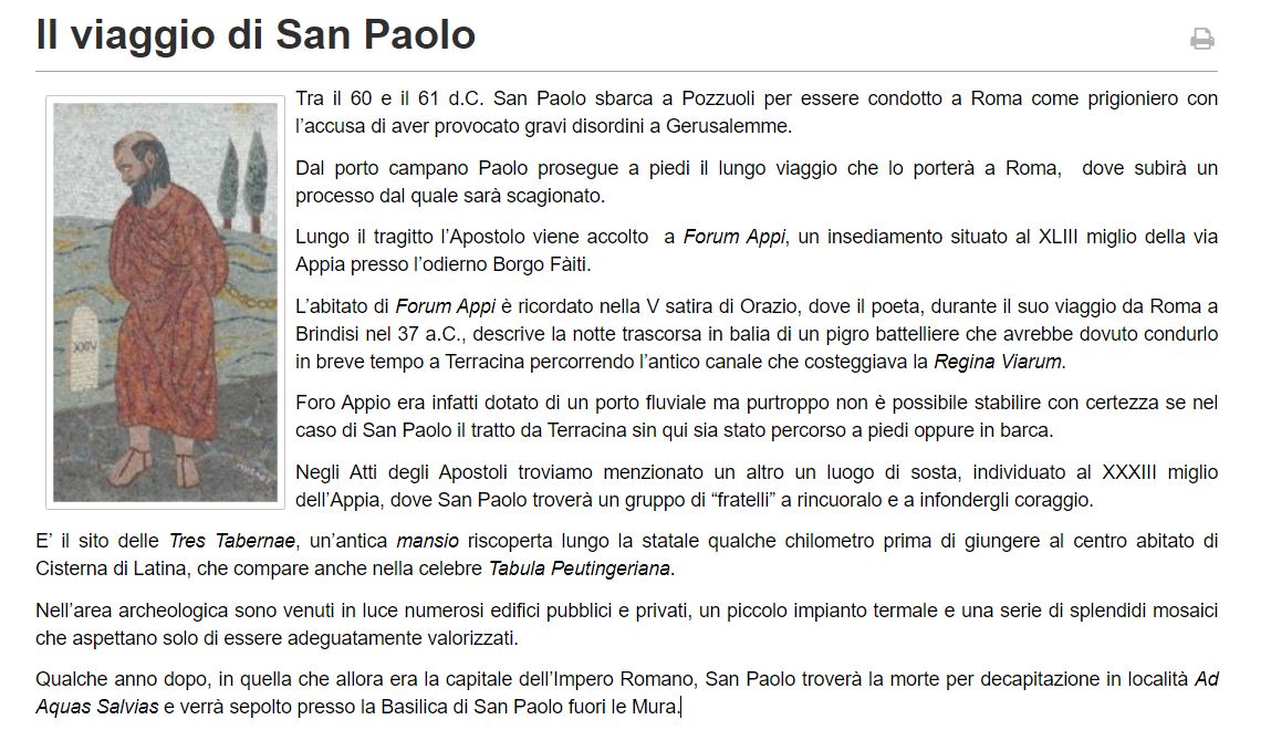 Alcuni cristiani, come riferiscono gli Atti degli Apostoli, saputo che Paolo stava per arrivare, gli andarono incontro e lo raggiunsero alle “Tre Taverne” (Tres Tabernae), appena fuori dell’attuale comune di Cisterna.