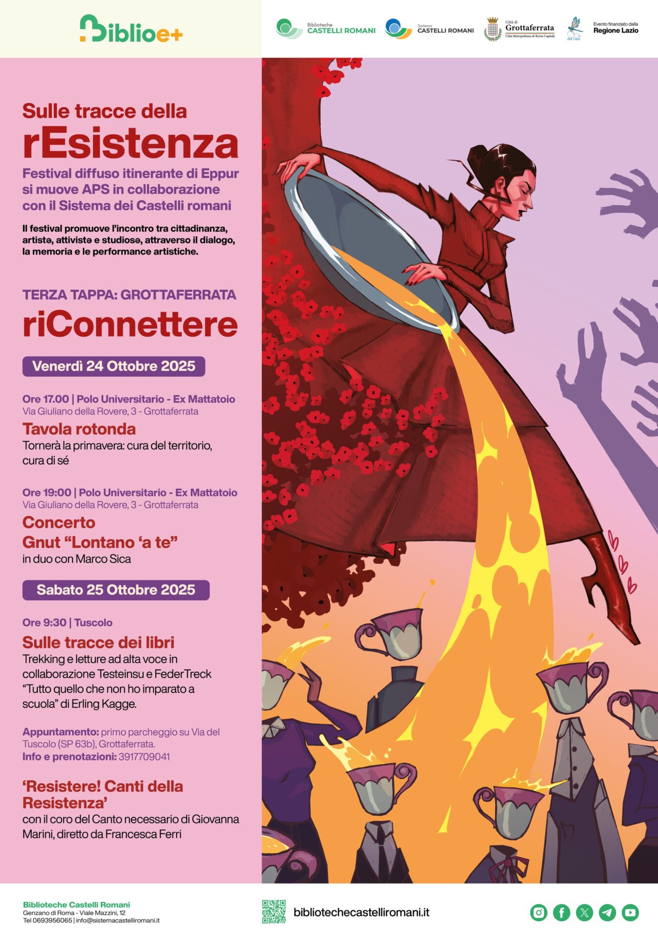 Sabato 25, invece, appuntamento alle ore 9.30 presso il primo parcheggio su via del Tuscolo SP 63B) per “Sulle tracce dei libri” con un inedito trekking – insieme all’Associazione “Testeinsu”e a FederTreck – con “Camminare” di Erling Kagge. Seguirà, alla fine del percorso, l’esibizione del coro del Canto necessario di Giovanna Marini, diretto da Francesca Ferri, con “Resistere! Canti della Resistenza”, nella splendida cornice del Tuscolo.
