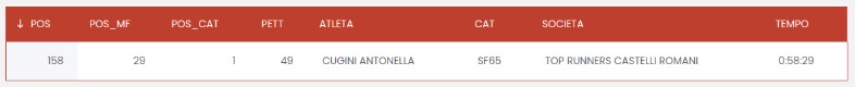 La storica cornice di Castello Colonna a Genazzano ha ospitato l’8^ edizione della ‘Genazzano a Perdifiato’ & Memorial Don Marcello Schiavella’, una gara podistica su strada di 9,5 km che ha attirato atleti da diverse società. La gara, partita alle 8:30, ha visto la partecipazione di Antonella Cugini, portacolori dei Top Runners Castelli Romani, che ha ottenuto un risultato eccezionale. Con un tempo di 58 minuti e 29 secondi, Antonella ha conquistato il 1° posto nella categoria SF65, classificandosi 158ª assoluta e 29ª tra le donne.