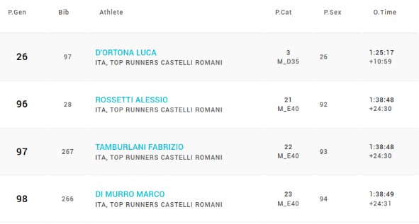 Tra i risultati di rilievo, Luca D’Ortona si è piazzato al terzo posto nella categoria M_D35 con un tempo di 1 ora, 25 minuti e 17 secondi. Notevole anche la performance di Fabrizio Tamburlani, che ha stabilito il proprio record personale con un tempo di 1:38:48, affiancato dai compagni Alessio Rossetti e Marco Di Murro, rispettivamente con tempi di 1:38:48 e 1:38:49, tutti nella categoria M_E40.