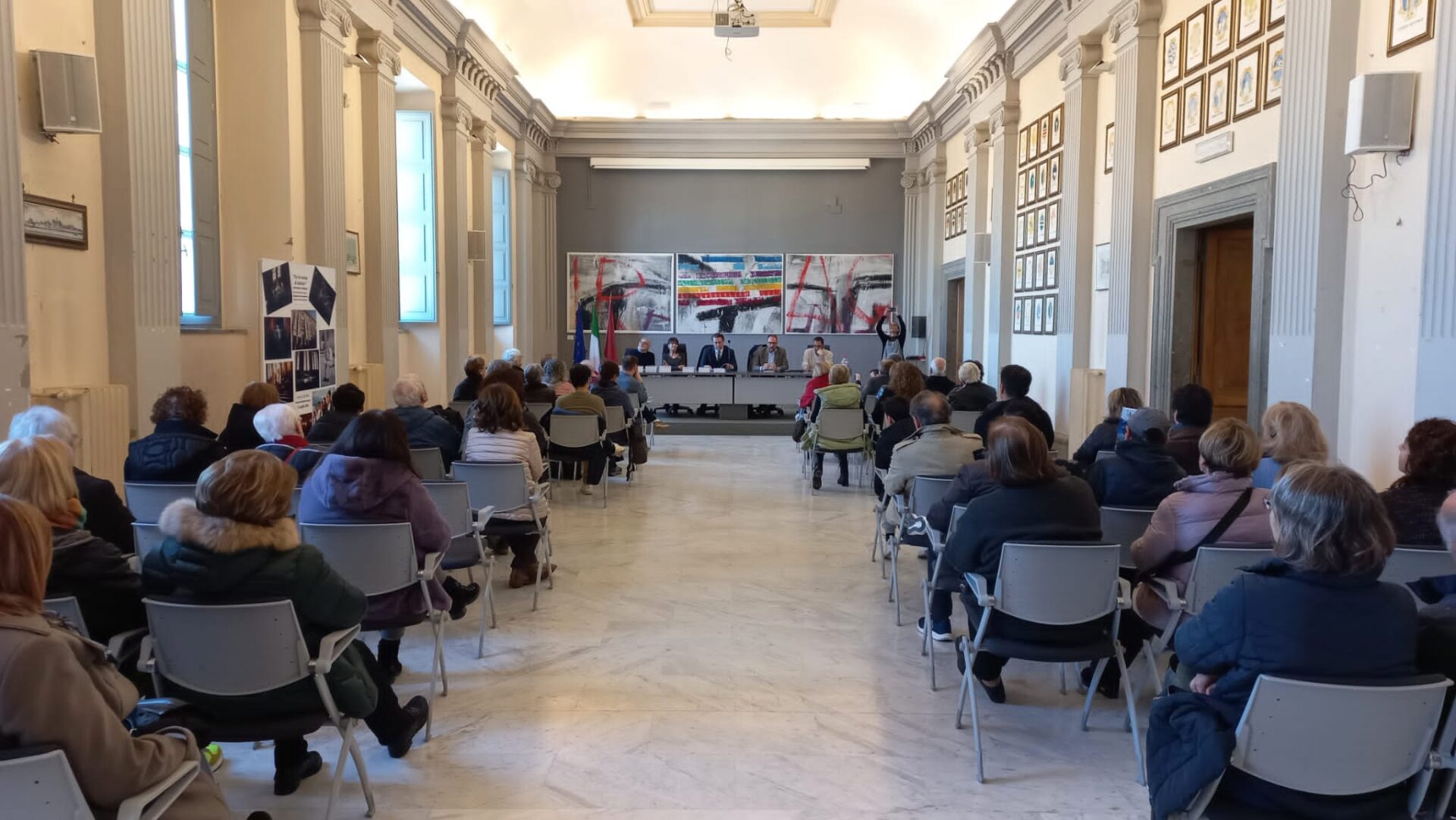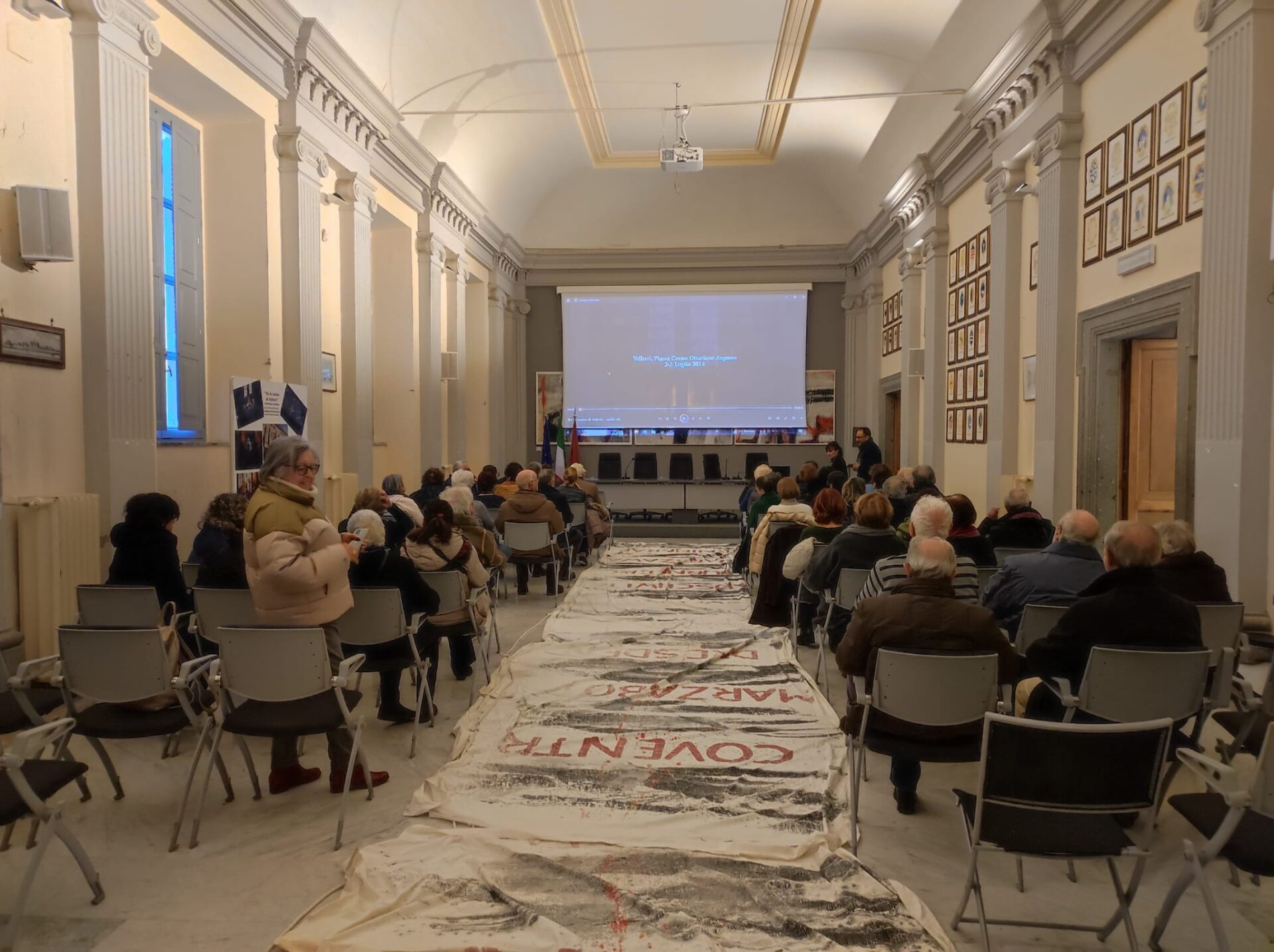 Al centro della sala Tersicore, in occasione di questa proiezione, è stato steso a terra il telo che il maestro Claudio Marini realizzò in occasione della prima dello spettacolo di Gian Maria Volontè nel 1994 e poi riutilizzato nella replica del 2014. In occasione di questa seconda proiezione, a dieci anni di distanza, il maestro Marini ha deciso di rispolverare questa opera, ormai quasi del tutto rovinata, consumata dallo scorrere del tempo, in cui sono riportati i luoghi del mondo che sono stati segnati dalla guerra. Questa volta invece di appenderlo, il maestro ha deciso di stenderlo a terra, proprio con l’intenzione di farlo calpestare dalle persone.