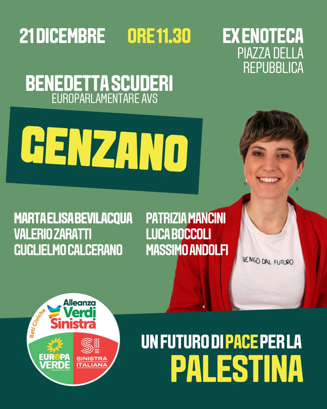 Genzano 17 dicembre 2025 – Domenica 21 dicembre alle ore 11:30, presso l’ex Enoteca di Genzano, in Piazza della Repubblica, si terrà l’iniziativa pubblica “Un futuro di pace per la Palestina”, organizzata da Europa Verde – Alleanza Verdi e Sinistra – Genzano Possibile.