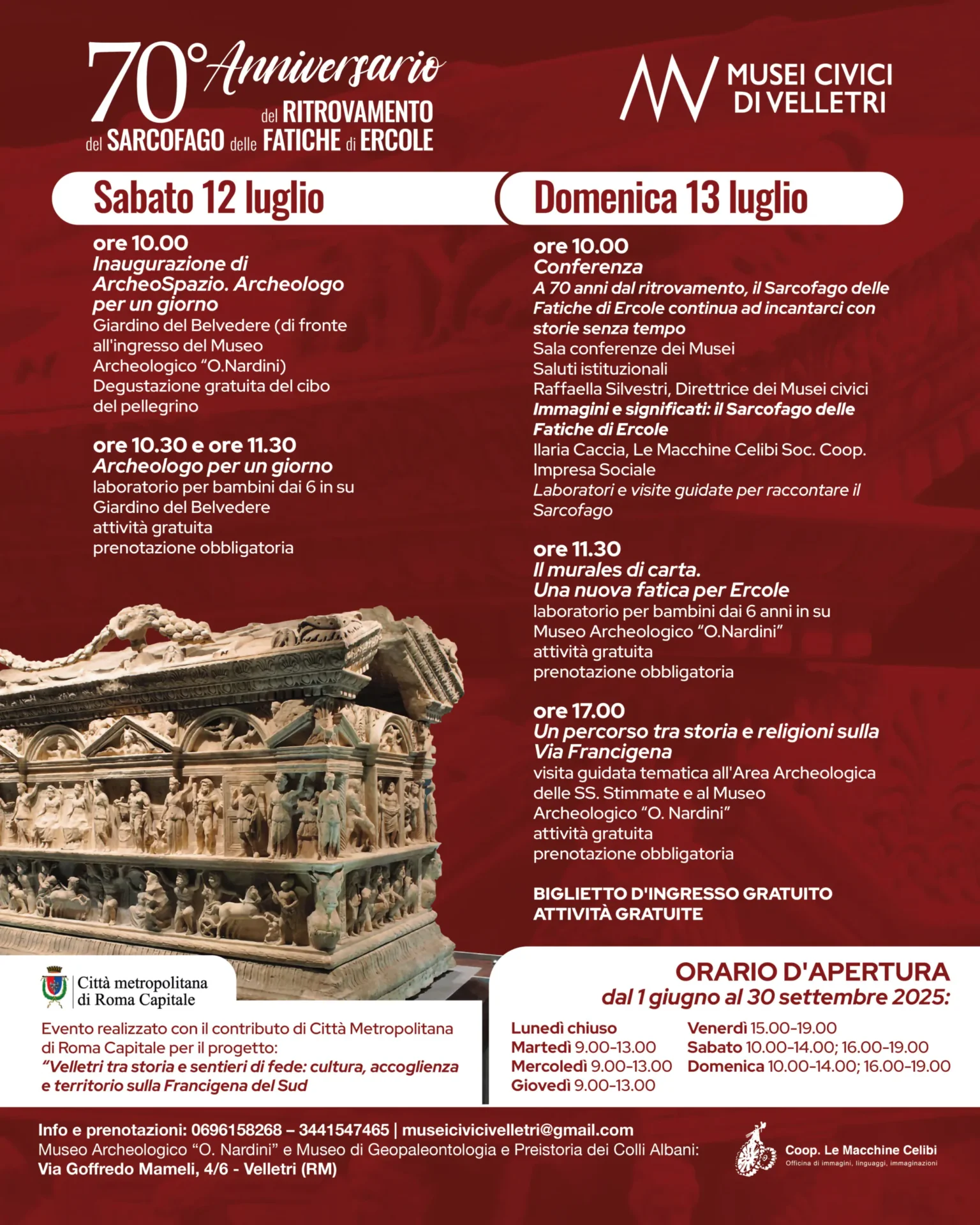 Velletri, 10 luglio 2025 – La città dei Castelli Romani si prepara a festeggiare un importante traguardo: a 70 anni esatti dal ritrovamento, avvenuto il 10 luglio 1955, del celebre Sarcofago delle Fatiche di Ercole, i Musei Civici di Velletri lanciano una serie di eventi culturali, laboratori e iniziative aperte a tutti, inserite nell’ambito dell’“Estate Veliterna 2025”.