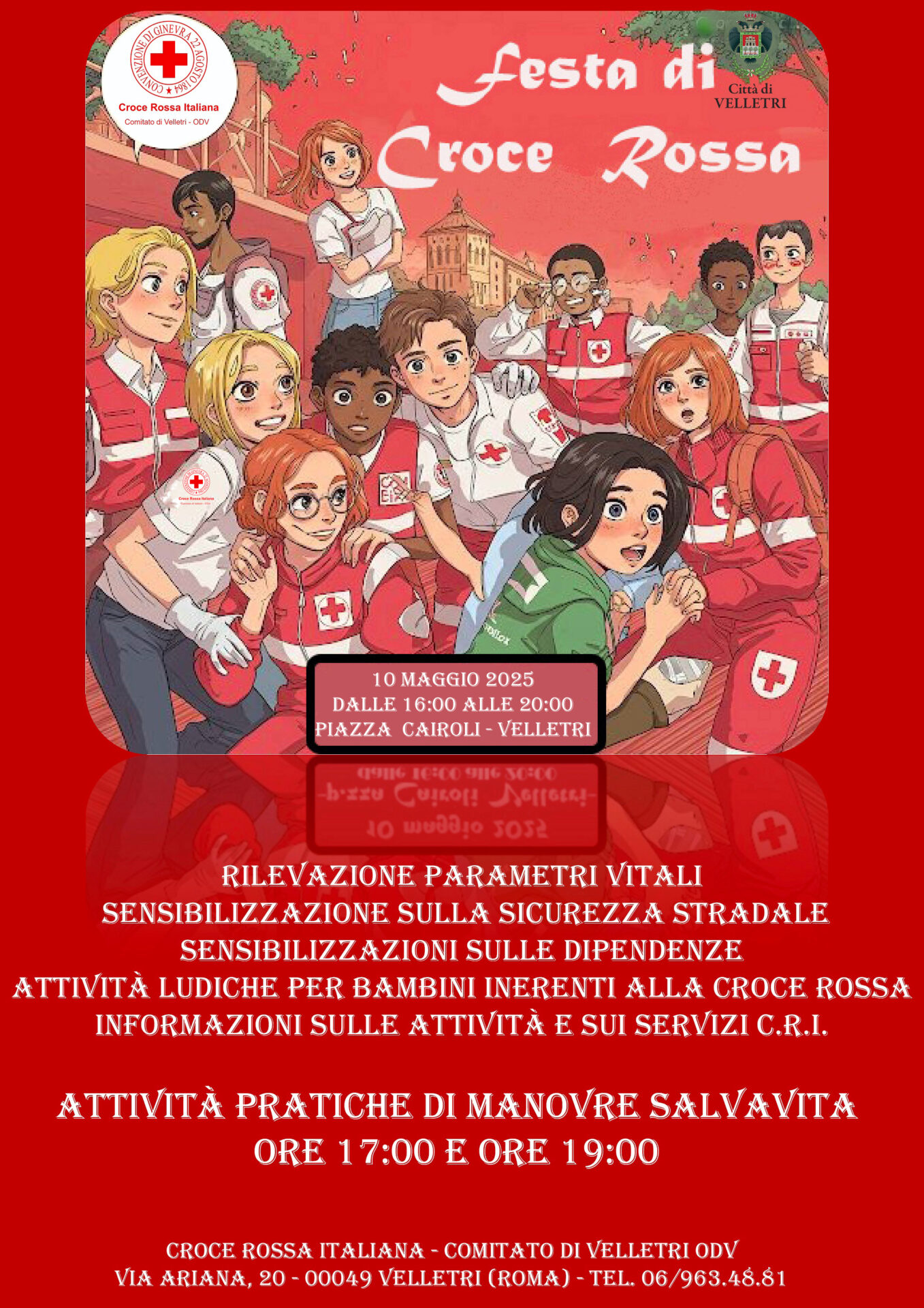 • L’evento avverrà sabato 10 maggio 2025, dalle 16:00 alle 20:00, Piazza Cairoli a Velletri, patrocinato dal Comune, offrirà ai cittadini un’occasione unica per conoscere da vicino le attività e i servizi della Croce Rossa Italiana