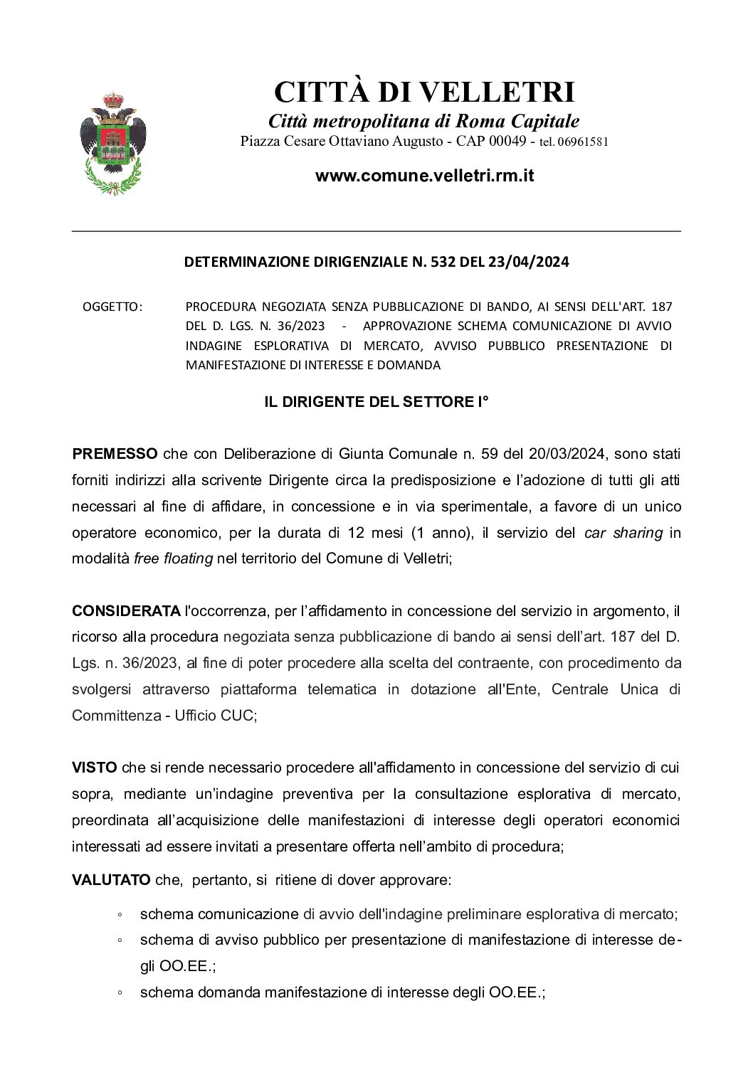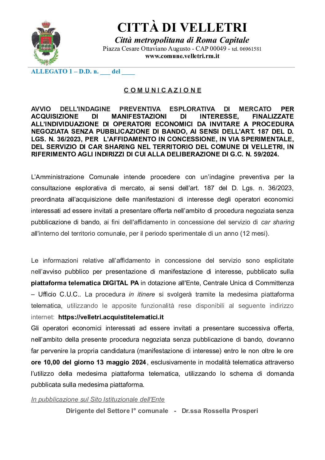 Nel sito ufficiale del Comune, in data 24 aprile 2024 si legge: “L’Amministrazione Comunale intende procedere con un’indagine preventiva per la consultazione esplorativa di mercato, ai sensi dell’art. 187 del D. Lgs. n. 36/2023, preordinata all’acquisizione delle manifestazioni di interesse degli operatori economici interessati ad essere invitati a presentare offerta nell’ambito di procedura negoziata senza pubblicazione di bando, ai fini dell’affidamento in concessione del servizio di car sharing all’interno del territorio comunale, per il periodo sperimentale di un anno (12 mesi).”