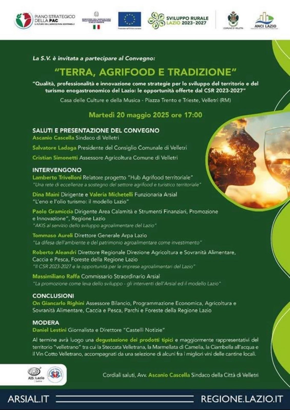 Velletri (Rm) – Nel pomeriggio di martedì 20 maggio 2025, la Casa delle Culture e della Musica di Velletri ha ospitato il convegno “Terra, Agrifood e Tradizione”, un momento di confronto aperto tra istituzioni, esperti e operatori del settore sull’evoluzione dell’agricoltura e del turismo enogastronomico nella regione Lazio. Al centro del dibattito, le opportunità offerte dal CSR 2023-2027, l’innovazione come motore di crescita e il rafforzamento delle filiere locali.